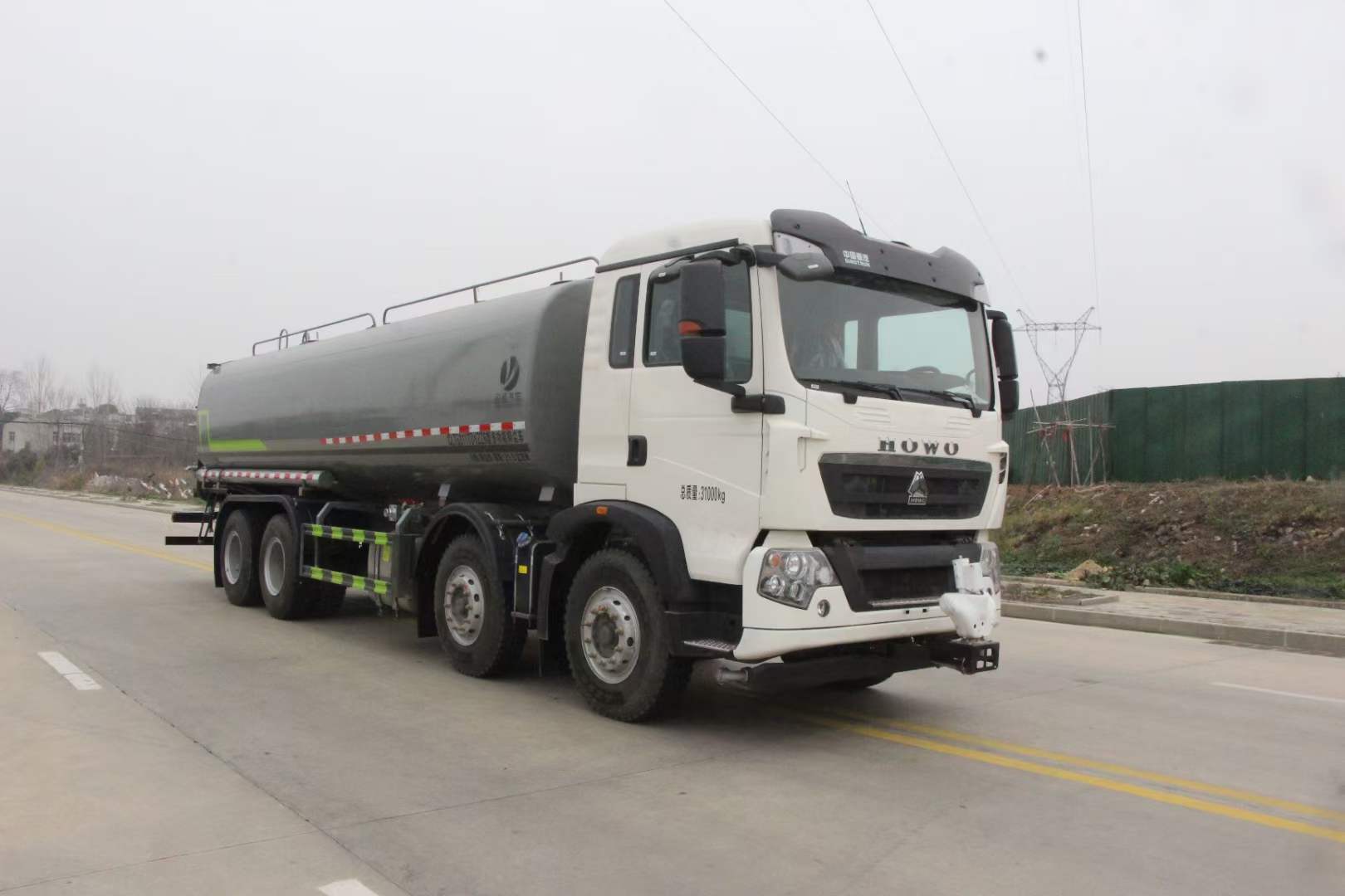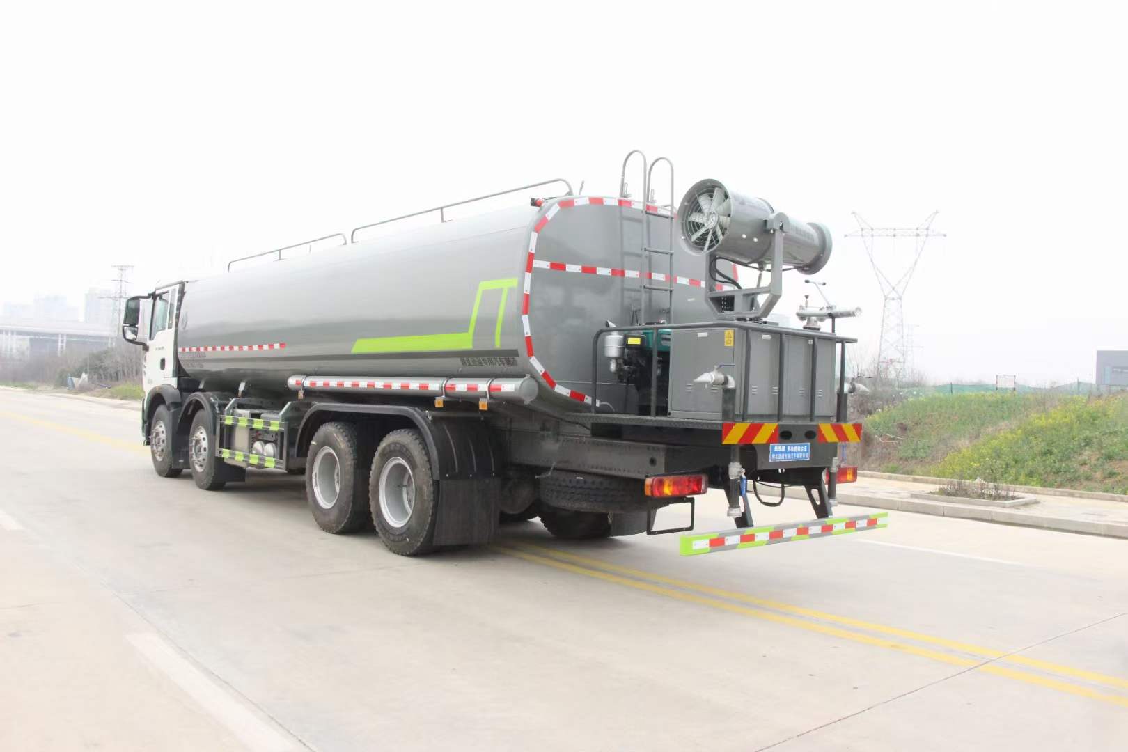豪沃28方灑水車_重汽豪沃28方抑塵車_重汽曼350霧炮車_湖北盈通專用汽車有限公司,該車用途為城鄉道路和鐵路礦場的抑塵降霾,主要裝置為罐體及噴霧裝置.罐體總容量:22.6立方米,罐體有效容積:21.5立方米;罐體外形尺寸(長×長軸×短軸)(mm):7700×2480×1730.ABS系統控制器生產企業/型號為威伯科(上海)管理有限公司/4460046300;選裝EBS,EBS系統控制器生產企業/型號為威伯科(上海)管理有限公司/EBS3.側、后防護材料均為:Q235碳鋼,連接方式均為:螺栓連接,后部防護截面尺寸(mm):120×50,后部防護離地高度(mm):490.僅采用底盤1800+3800+1350軸距(mm)改裝.隨底盤選裝前面罩,選裝后處理樣式,選裝踏步樣式.選裝前部不帶電子霧炮,選裝前部電子霧炮樣式.當前部不帶電子霧炮時,車輛長度11550mm,無前伸;當前部選裝電子霧炮時,車輛長度12050mm,前伸500mm.后軸僅采用鋼板彈簧懸架.選裝自動球閥位置,選裝后對沖裝置,選裝罐體頂部高位花灑裝置,選裝前沖裝置樣式.隨底盤選裝駕駛室.選裝噴霧裝置樣式.選裝箭頭燈裝置,選裝方形罐口及罐口位置,選裝尾部自流口裝置,選裝工具箱裝置. |