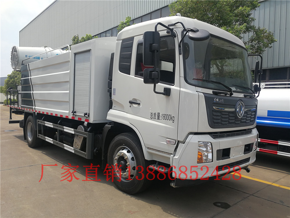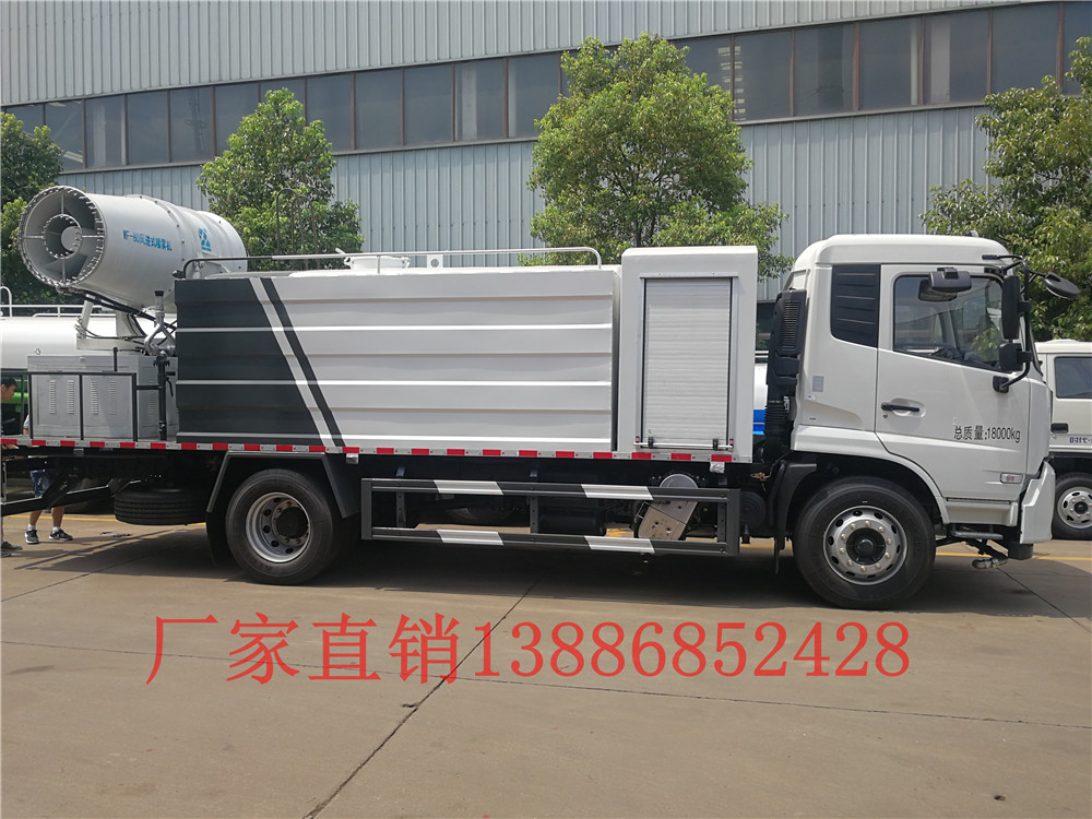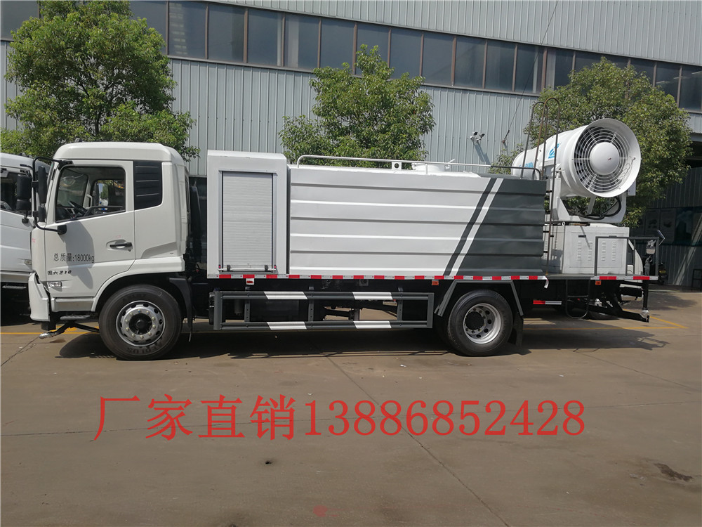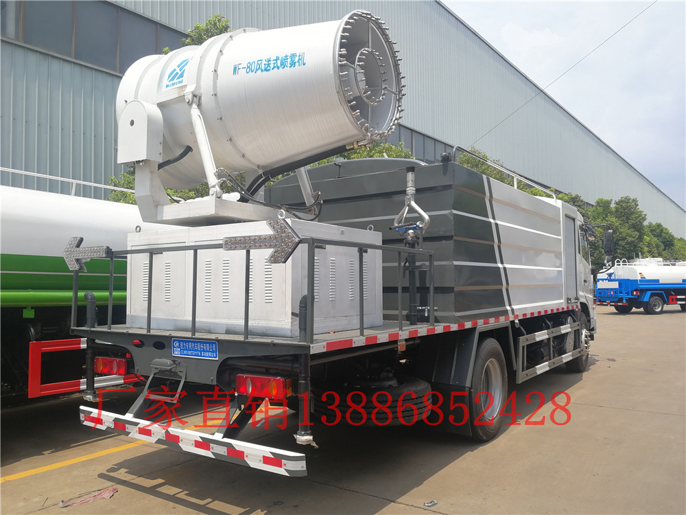 東風天錦12噸灑水車CLW5180GSSYT6,搭配30米霧炮機,可遙控或人工控制,并可隨意調解水平旋轉及噴霧角度,使用安全可靠;霧炮機是根據風送原理,先使用進口高壓泵、微細霧化噴嘴將水霧化,再利用風機風量和風壓將霧化后的水霧送到較遠距離,使得水霧到達較遠距離同時能夠覆蓋更大面積,水霧與粉塵凝結后降落,從而達到降塵目的。