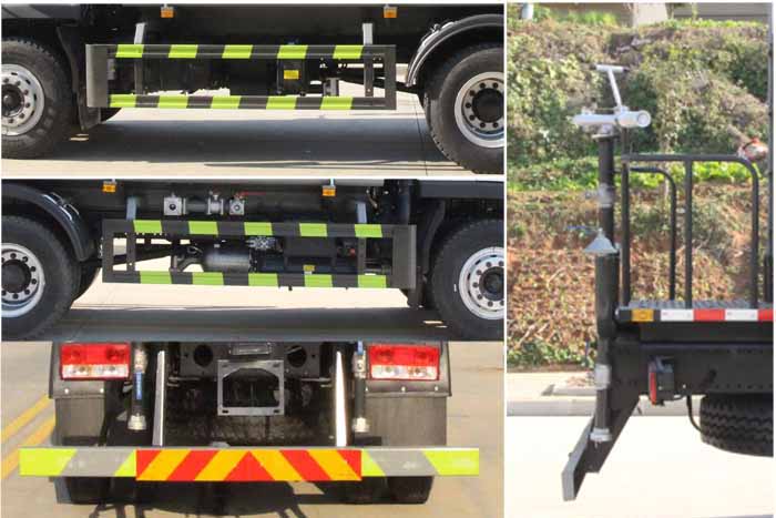 該車主要用于城鄉園林綠化噴灑作業;主要裝置為水罐及噴灑裝置;罐體總容量:11.66立方米;罐體有效容積:11.1立方米;罐體外形尺寸(長×長軸×短軸)(mm):4200×2300×1450.運輸介質:水,密度1000千克/立方米;ABS型號為CM4XL-4S/4M,生產廠家為廣州瑞立科密汽車電子股份有限公司.側、后防護材料均為:Q235碳鋼,連接方式均為:螺栓連接;后部防護截面尺寸(mm):120×50,后部防護離地高度(mm):480.隨底盤選裝限速裝置,限速88km/h.選裝前部電子水炮裝置樣式,選裝前部不帶電子水炮;當前部帶電子水炮時,前伸500mm,整車長度為8250mm,8000mm;當前部不帶電子水炮時,前伸為0mm,整車長度為7750mm,7500mm.僅采用底盤3950mm軸距改裝.隨底盤選裝新款前格柵,新款保險杠,新造型前霧燈.選裝油箱電瓶安裝位置,選裝車輛前部鴨嘴裝置. |